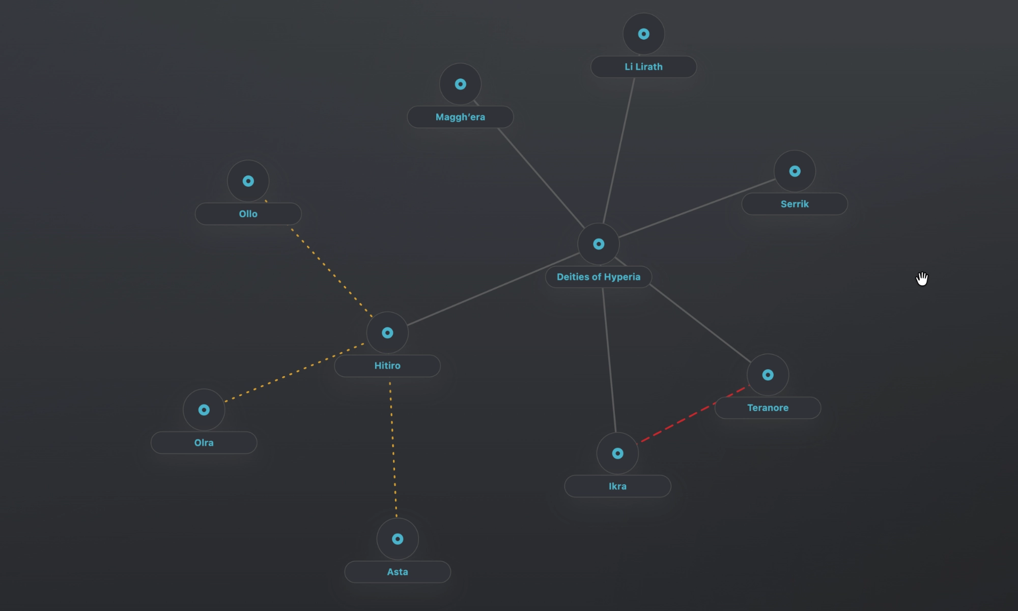 Visualise the relationships that drive your story with flexible connection maps that track factions, families, loyalties, and rivalries. Whether you're mapping conspiracies or bloodlines, every node links back to your documents, keeping your campaign’s people and power structures clear and easy to navigate.