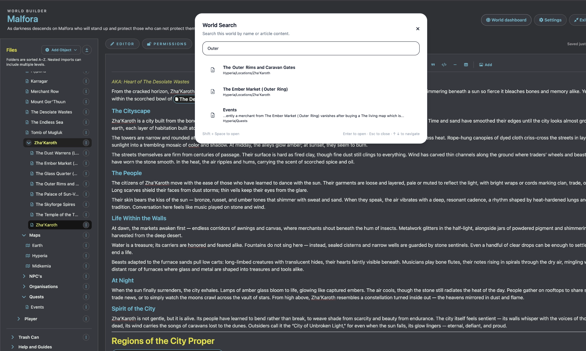 Write, organise, and access your world without breaking immersion using powerful Markdown editing, file uploads, and seamless cross-linking. Keep your notes, images, PDFs, and references connected so everything you need is always one click away during prep or play.